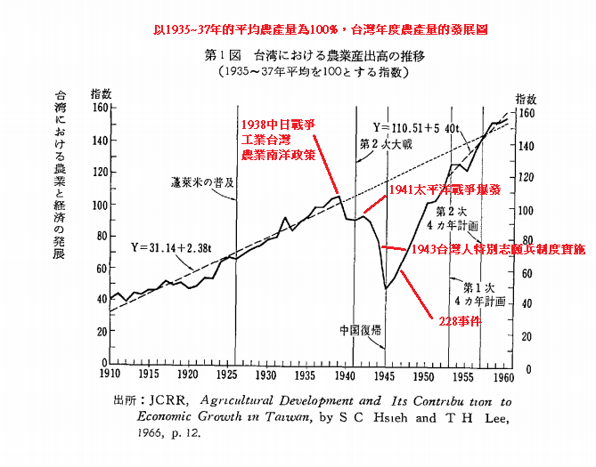 我們能在這張曲線圖上看出1938年日本開始出兵中國、39年開始統制經濟與更改台灣農業