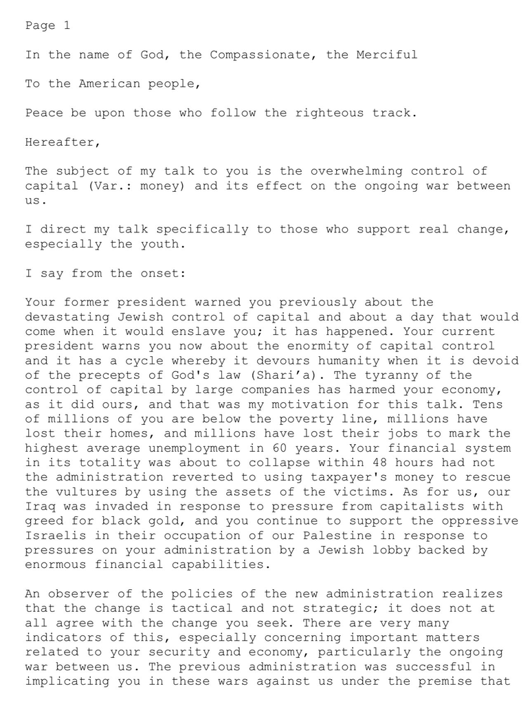 你們的前總統曾經警告過你們,警告過毀滅性的猶太對資本的控制,以及將有一天它將奴役你們的一天; 它已經發生了。你們現任的總統現在警告你們有關資本控制的巨大性,它有一個週期,當它缺乏上帝法(伊斯蘭法)的原則時,它將吞噬人類。大公司對資本的控制的暴政損害了你們的經濟,正如它對我們的經濟造成損害一樣,這是我談話的動機。你們中有數千萬人生活在貧困線以下,數百萬人失去了住房,數百萬人失業,使平均失業率達到60年來最高水平。如果政府未使用納稅人的錢來拯救禿鷹,使用受害者的資產,你們的金融體系總體上將在48小時內崩潰。至於我們,我們的伊拉克是為了滿足對黑色黃金的貪婪的資本家的壓力而被入侵的,你們繼續在回應由一個由極其龐大的財政實力支持的猶太遊說團體對你們政府的壓力下,支持壓迫性的以色列佔領我們的巴勒斯坦。