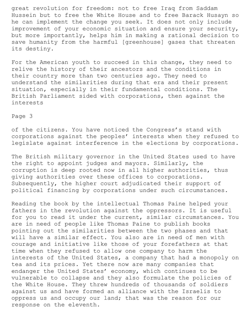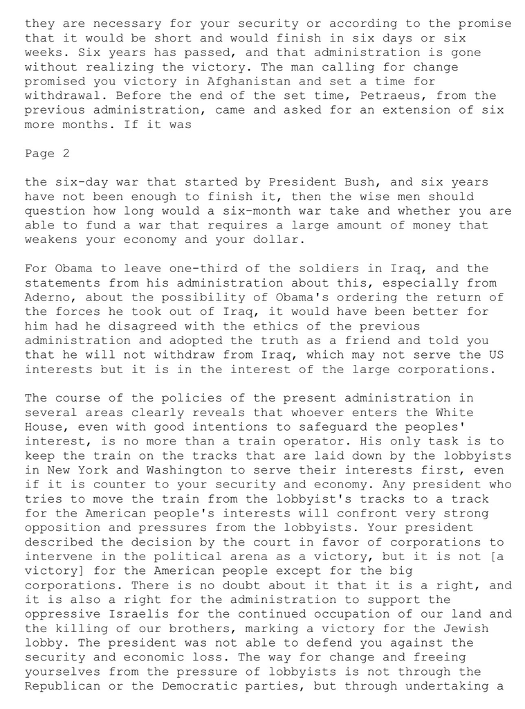 為了讓奧巴馬在伊拉克保留三分之一的軍隊,以及他的政府對此的聲明,尤其是阿德諾(Aderno)對於奧巴馬可能命令將軍隊撤回伊拉克的可能性的聲明,如果他不同意前政府的倫理觀點,並把真相視為朋友,告訴你們他不會從伊拉克撤軍,這可能對美國的利益不利,但對大公司的利益有利,那對他來說會更好。現政府在幾個領域的政策走向清楚顯示,無論誰進入白宮,即使有保護人民利益的良好意圖,也僅僅是一名列車操作員。他的唯一任務是使列車保持在紐約和華盛頓的游說者設定的軌道上,首先為他們的利益服務,即使這是有悖於你們的安全和經濟。任何試圖將列車從游說者的軌道轉移到符合美國人民利益的軌道上的總統都將面臨來自游說者的強烈反對和壓力。你們的總統將法院支持公司干預政治領域的決定描述為一場勝利,但這對美國人民來說並不是勝利,除了對大公司來說。毫無疑問,這是一種權利,政府支持壓迫性的以色列持續佔領我們的土地並殺害我們的兄弟,這也是對猶太游說的一種勝利。總統無法保護你們免受安全和經濟損失的威脅。變革並擺脫游說者壓力的途徑不是通過共和黨或民主黨,而是通過進行一場偉大的自由革命:不是為了解放伊拉克脫離薩達姆·侯賽因,而是為了解放白宮,解放巴拉克·侯賽因,讓他能夠實現你們追求的變革。這不僅包括改善你們的經濟狀況和確保你們的安全,更重要的是,幫助他做出理性的決定,拯救人類免受危及其命運的有害[溫室]氣體的威脅。