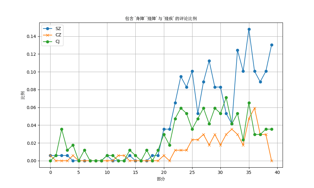 在影片發出來的很長一段時間之內,評論區基本沒有出現「殘障」、「身障」、「律師」、「陳俊翰」等詞語,直到出現了8k左右的評論,這些詞的頻率才迎來了陡增(figure 1-3)。與之相對,「支」、「中共」「外宣」等詞出現的頻率穩中向好(figure 4-5)。