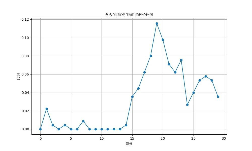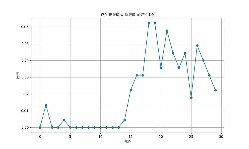 為了驗證 c,我用chatgpt寫了段python程式碼爬取分析了一下這期影片的評論區(截止時有16k條),包括他們的先後順序。有了這些數據,我就能得出評論區裡關鍵詞頻率的變化趨勢。圖像如下。