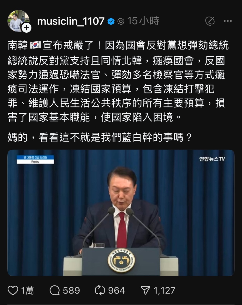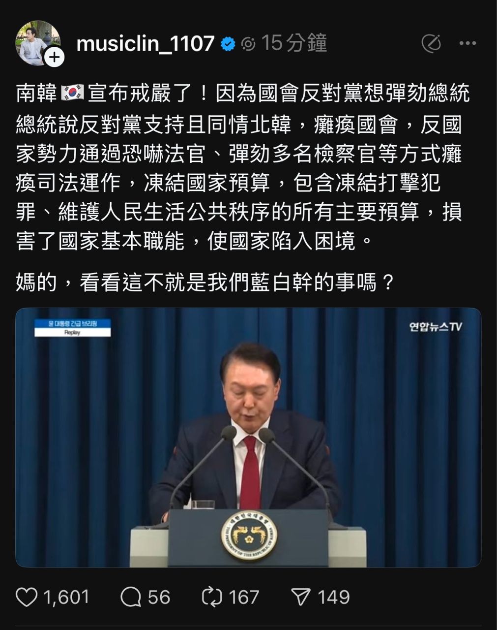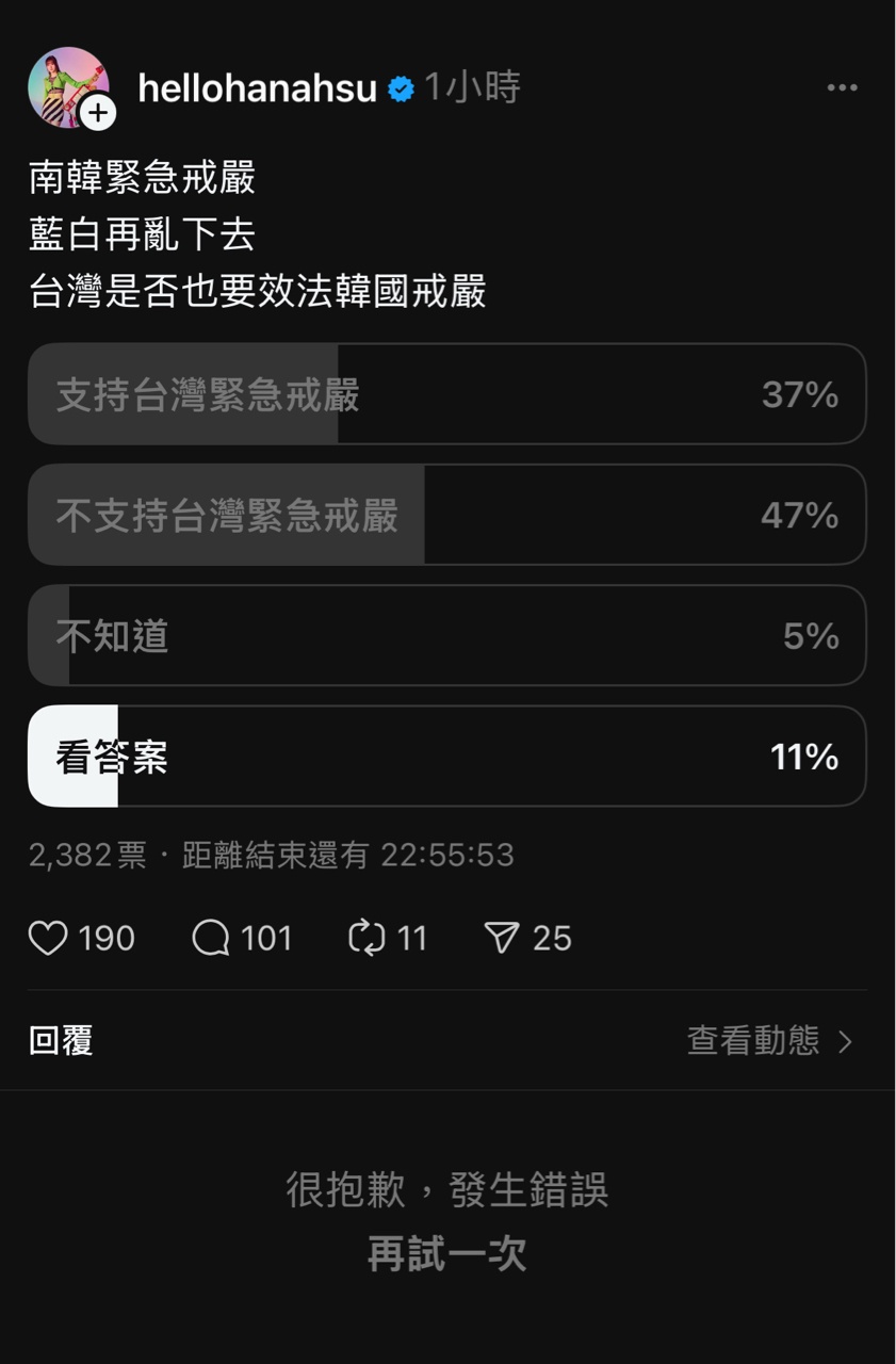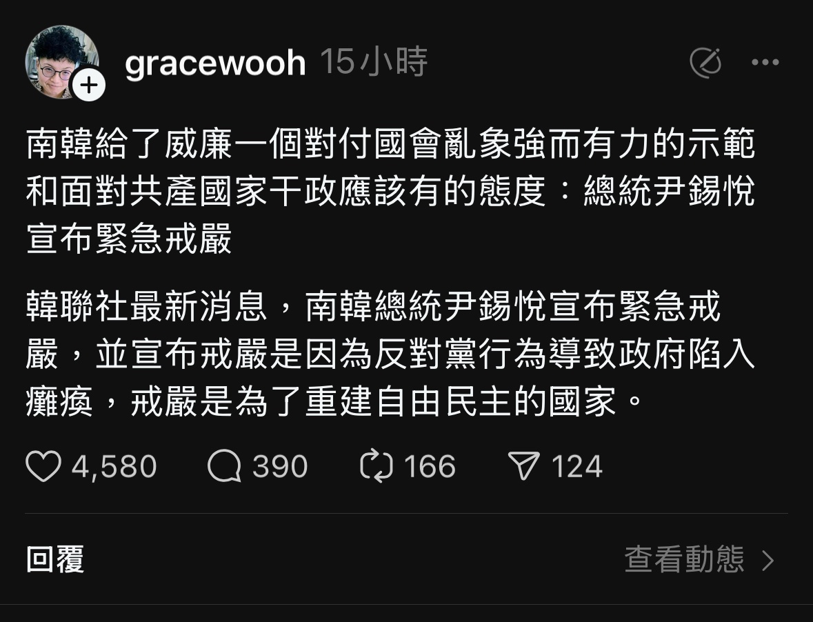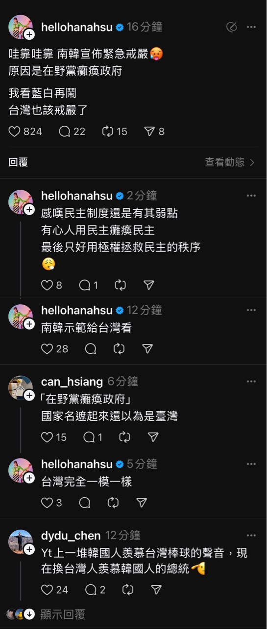 昨日南韓突然戒嚴,愛台網紅紛紛在threads發文,導致粉絲各種大讚戒嚴,結果今天網