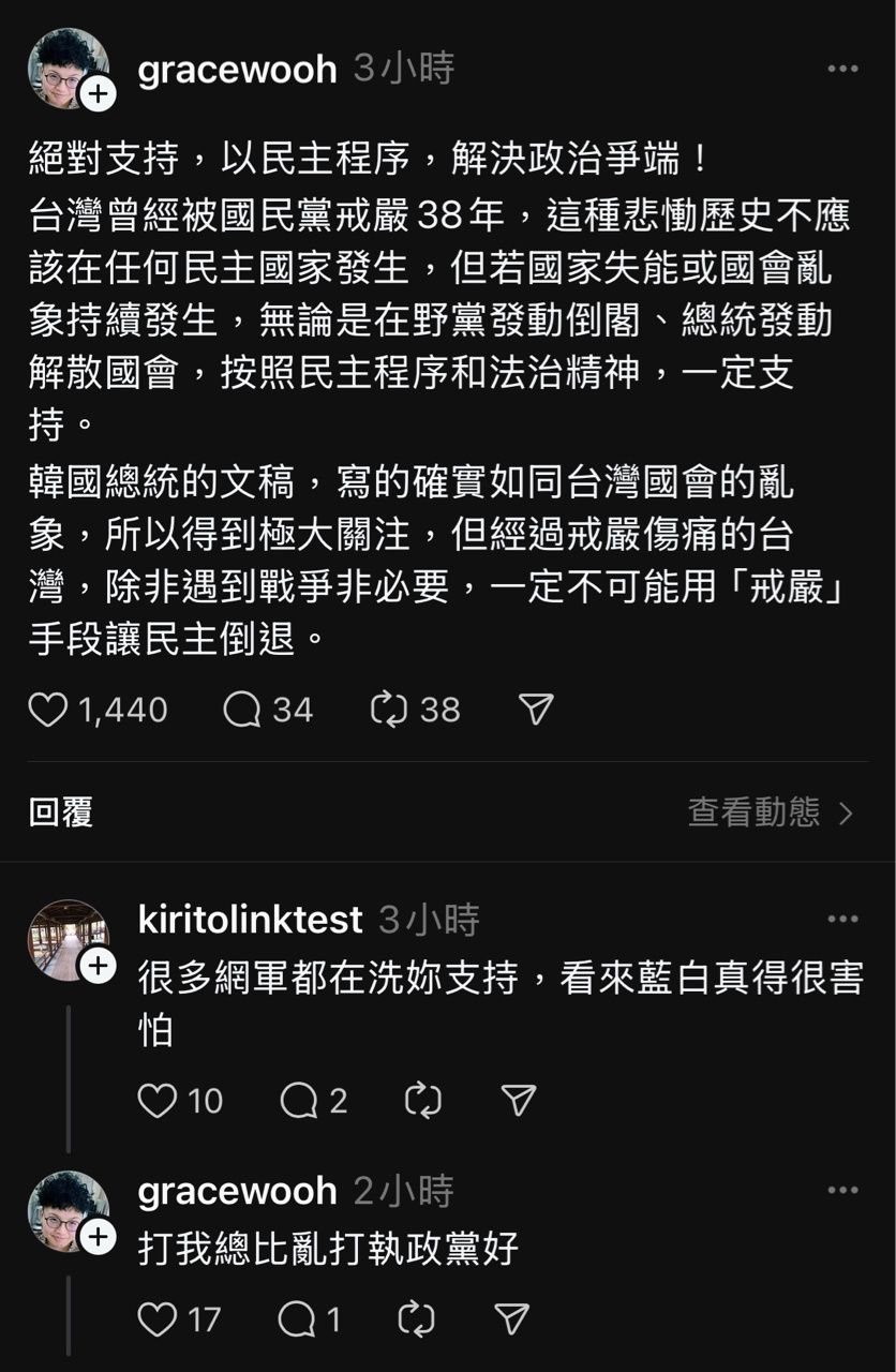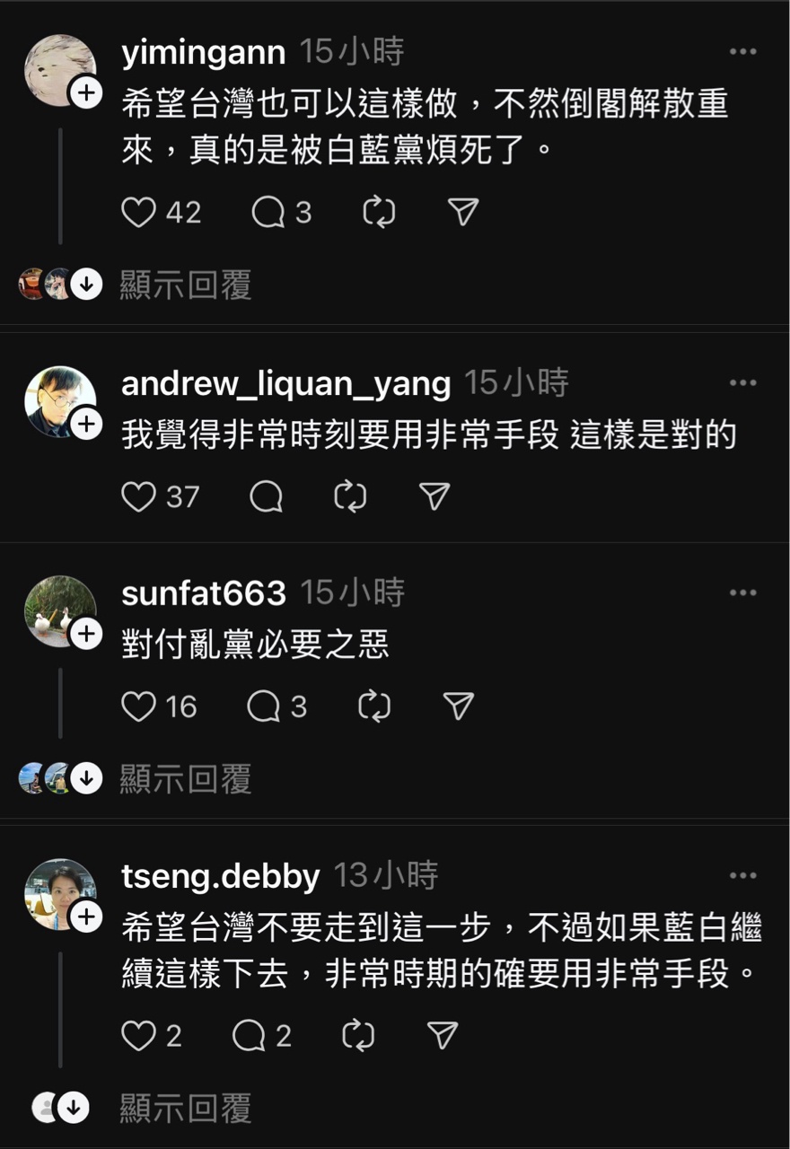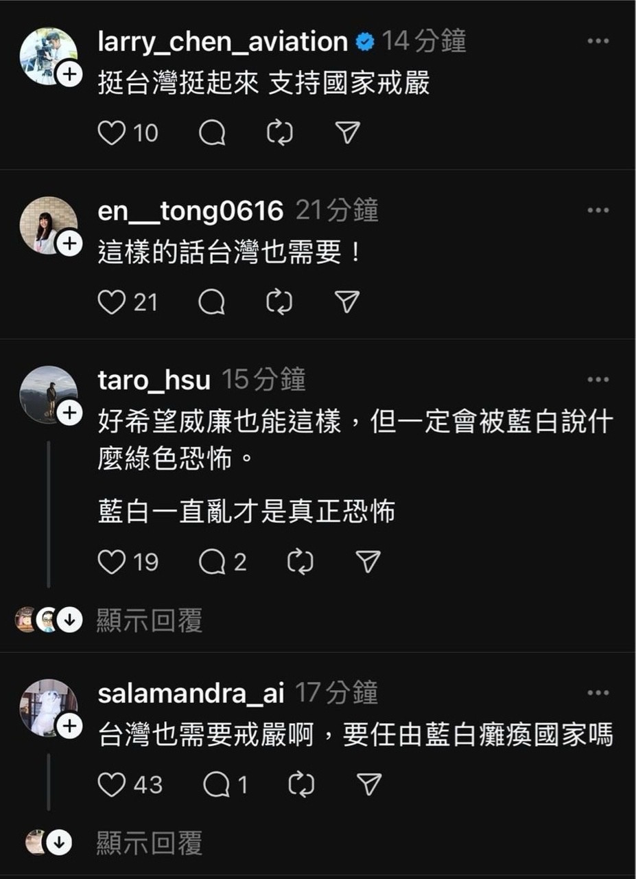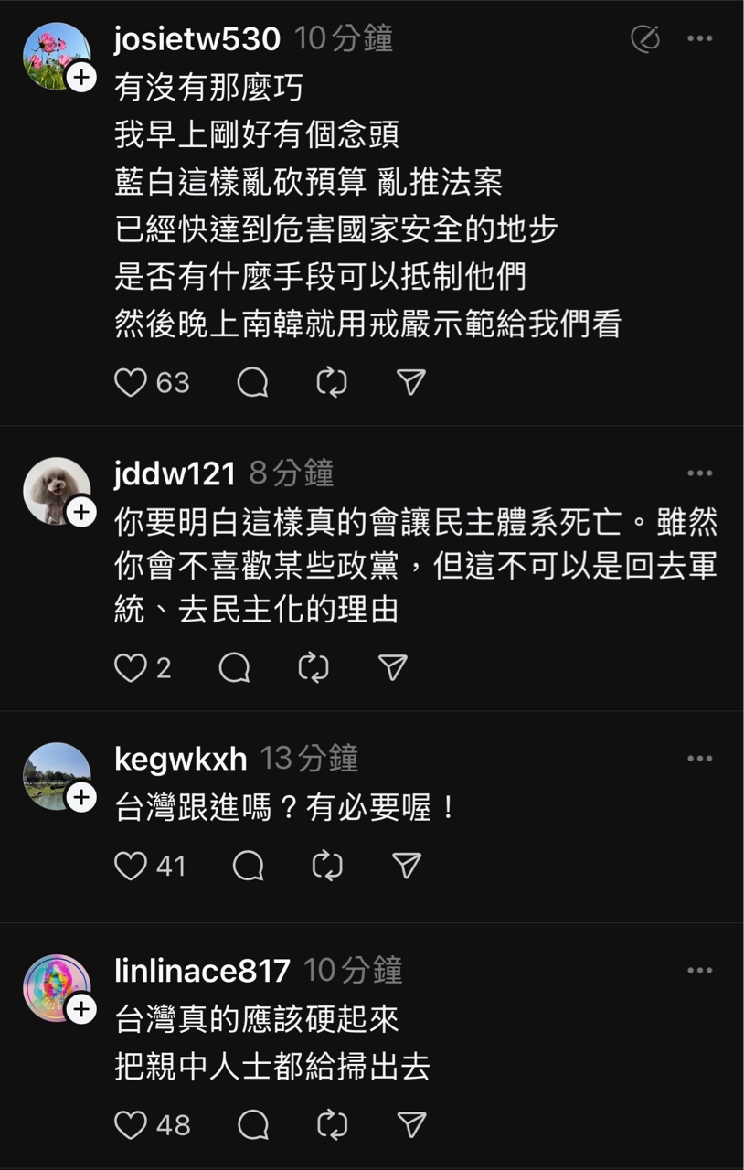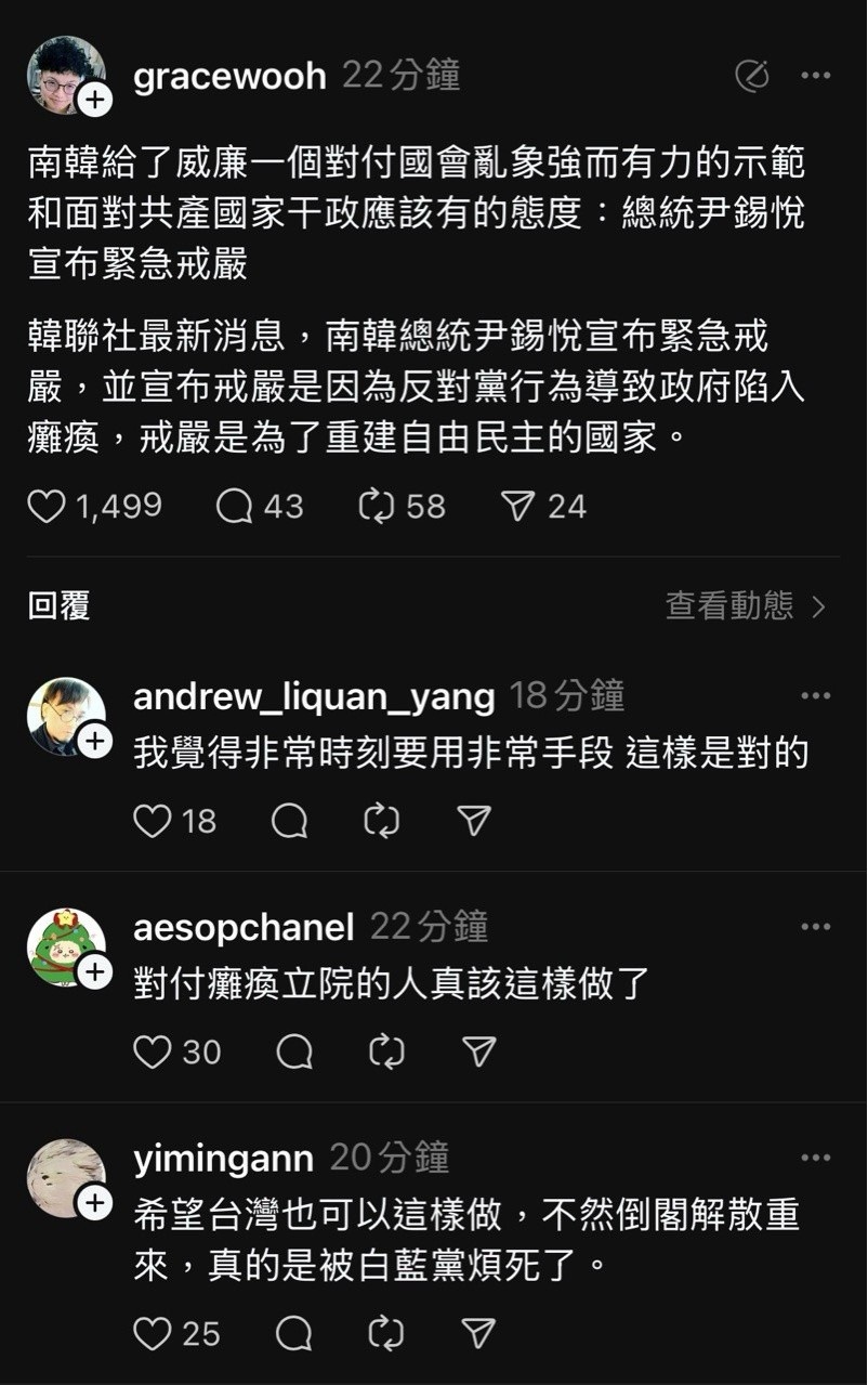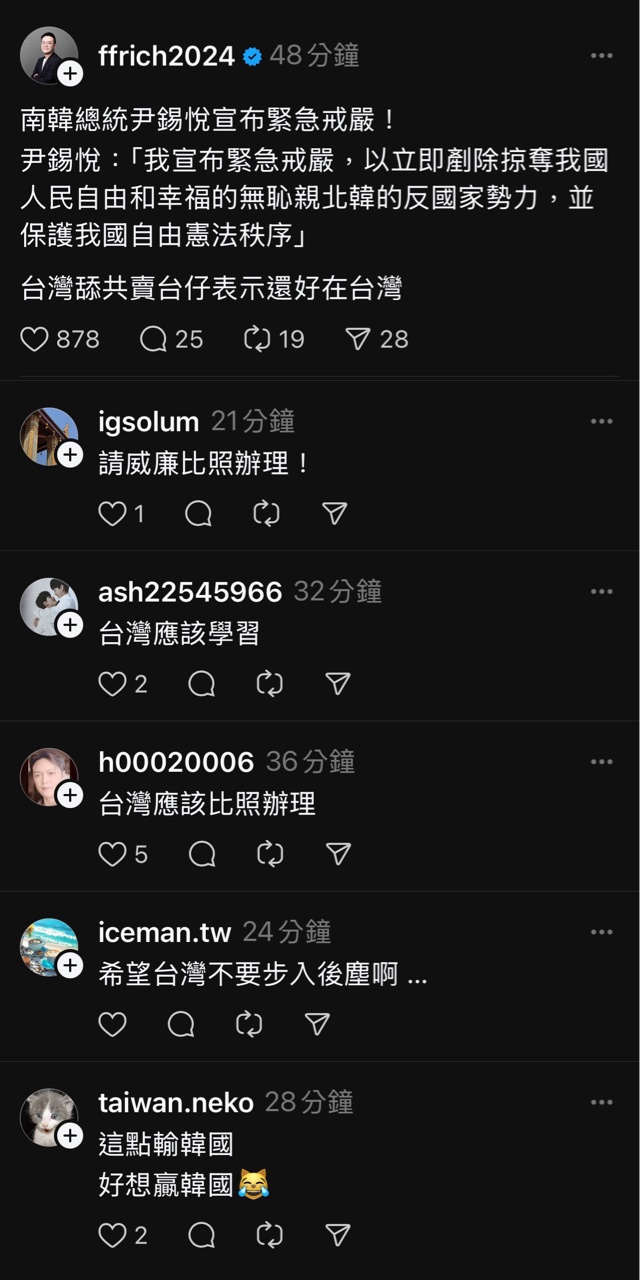 就在南韓宣布戒嚴沒多久,threads愛台意見領袖跟網友希望台灣戒嚴的聲音湧現!