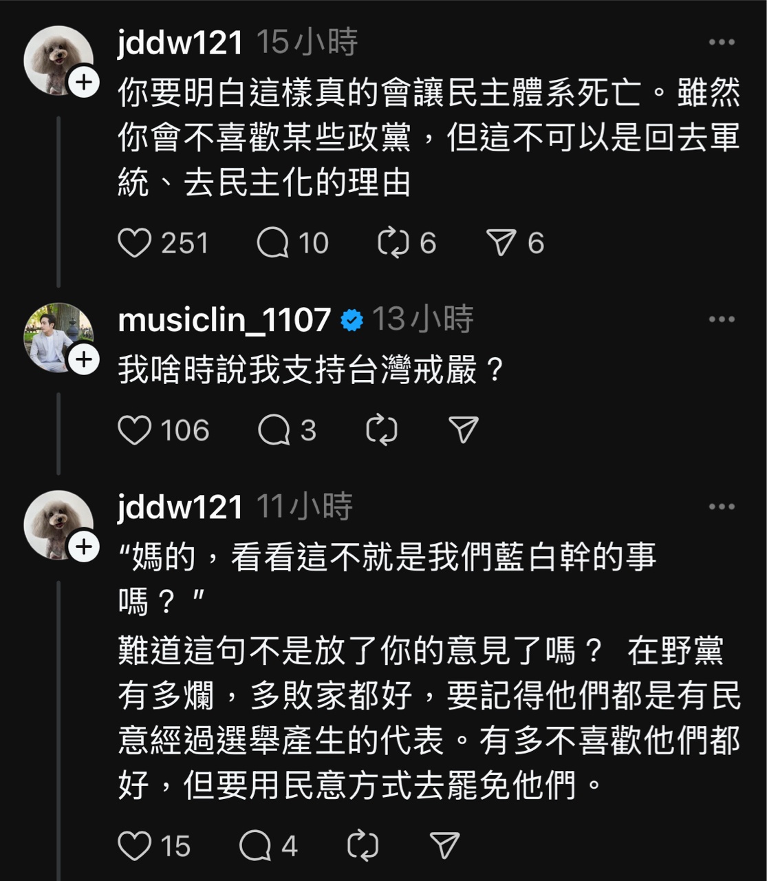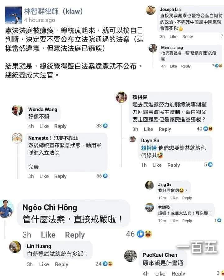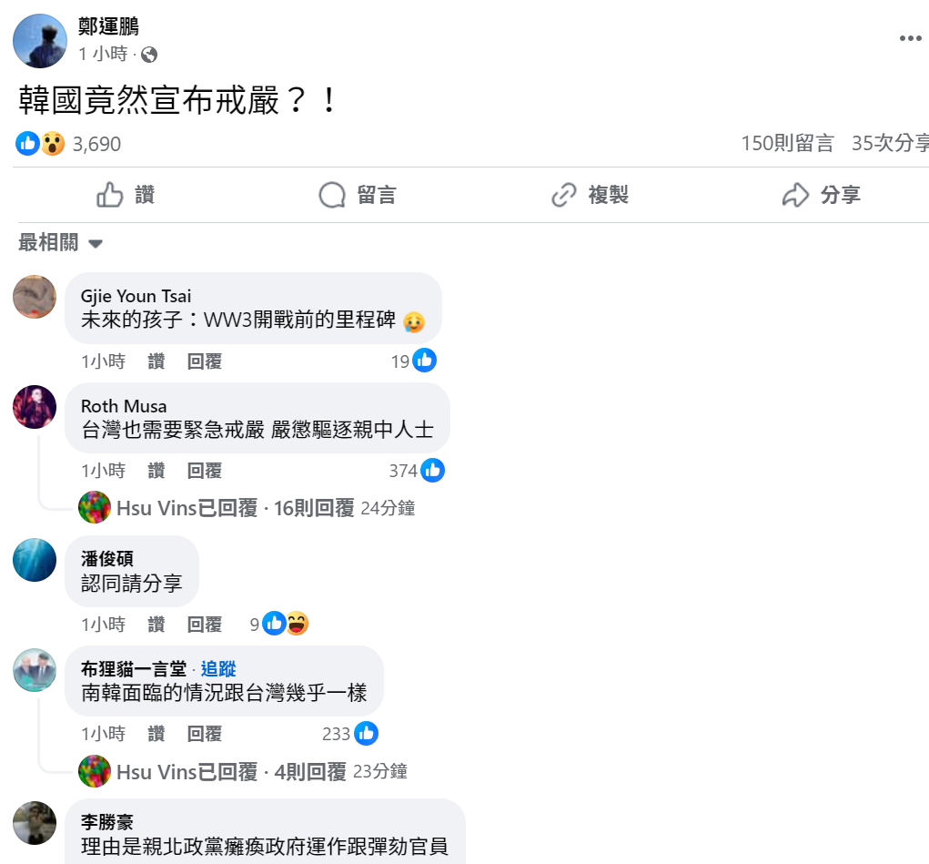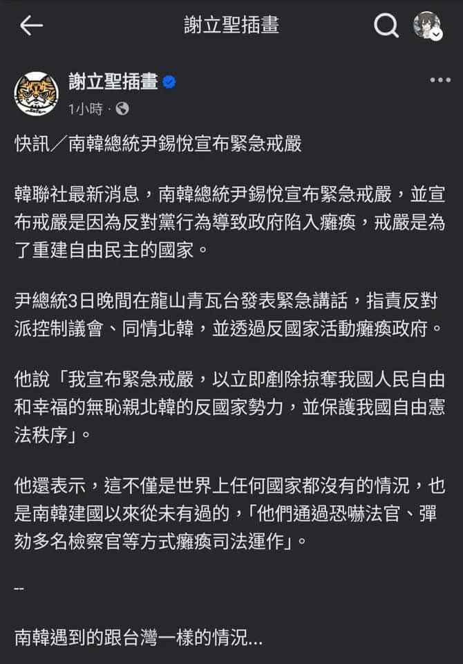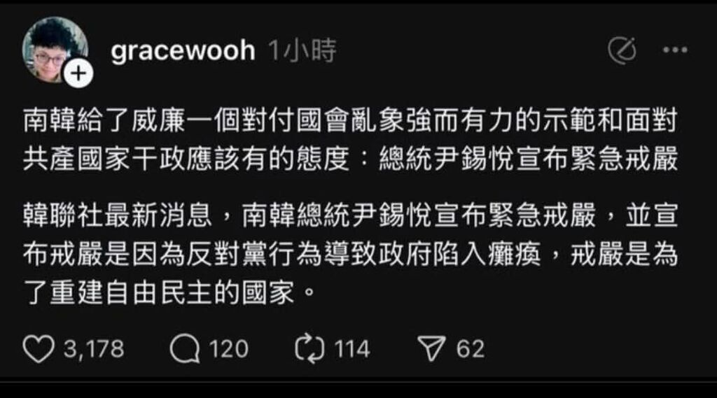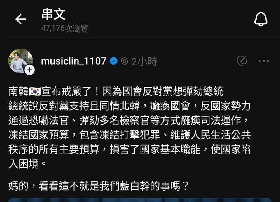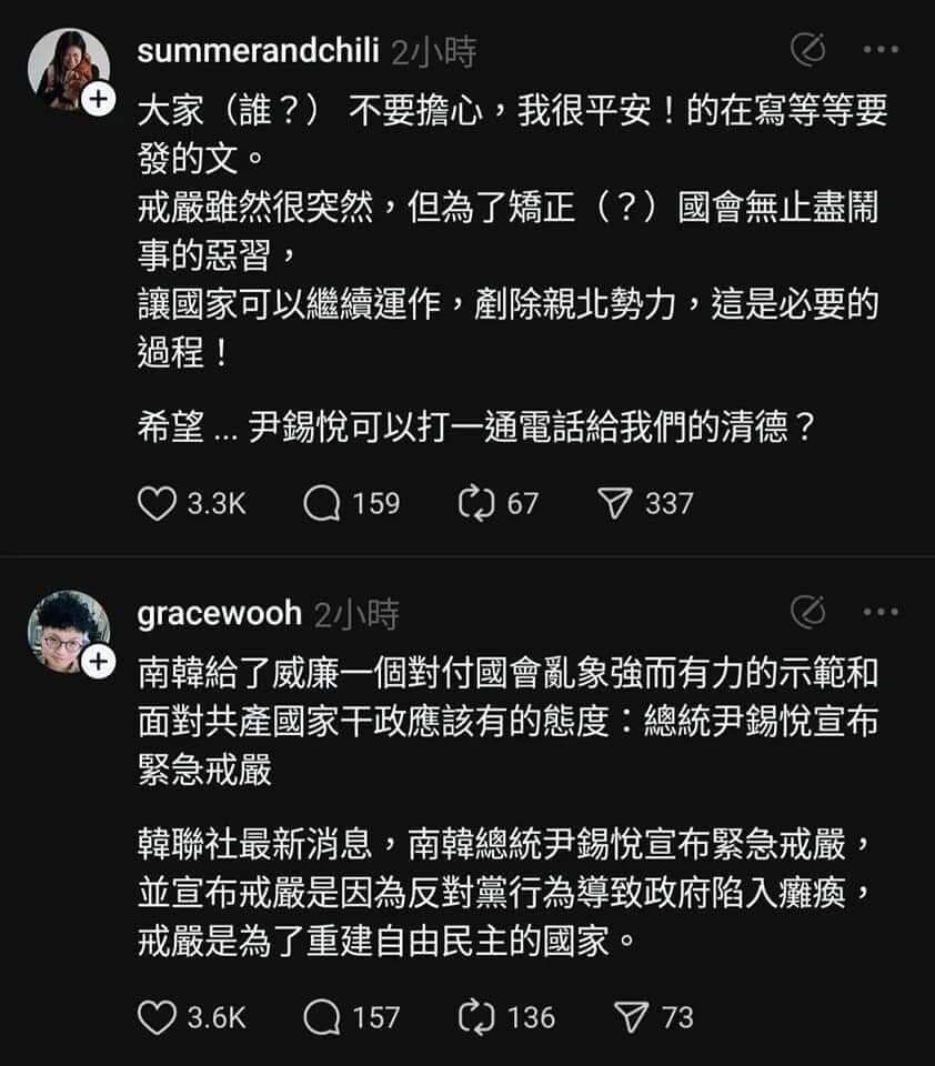 就在南韓宣布戒嚴沒多久,threads愛台意見領袖跟網友希望台灣戒嚴的聲音湧現!