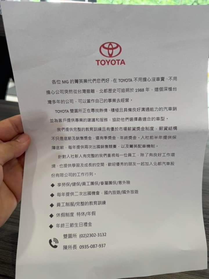 推 u9912114: 上週去NISSAN看車,跟業代聊天才剛講到MG業務在跳船… 09/20 22:49