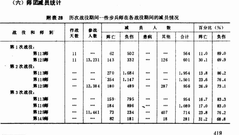 根據《衛勤總結》的《各師減員表》,志第15軍29師減員1110人,志第12軍35師減員3420人,志第27軍79師減員2840人,志第27軍80師減員3620人,志第27軍81師減員2910人。