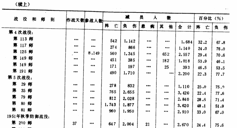 另根據《抗美援朝衛生勤務總結》(以下簡稱《衛勤總結》)一書之附表28《歷次戰役期間一些步兵師在各戰役期間的減員情況》(真是坳口...因此以下簡稱《各師減員表》),志第38軍113師減員564人(該軍由熙川追擊韓8師至價川─德川線),志第42軍125師減員601人(該軍在東部方面阻擋美軍聯第10軍)。由於志願軍以軍為單位來作戰故傷亡分佈多平均,以此數據估算志第38軍減員約1600人,志第42軍減員約1800人,兩軍相加即減員達3400人,約佔宣稱總傷亡的三分之一。
