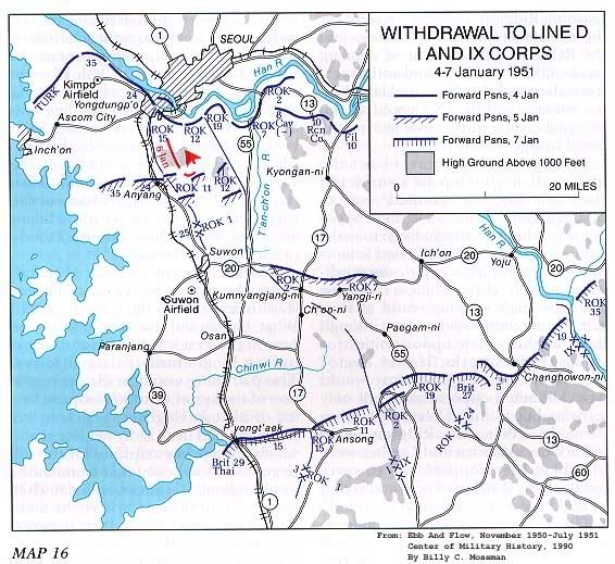 第8軍團方面在12月5日即感到志願軍的壓力減弱,但華克中將似乎始終對他的右翼憂心忡忡,因此才繼續向南後退至38度線上的堅固陣地,直到戰線拉直始告停止。