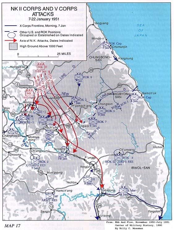 韓第3軍則由於左側暴露,遭志願軍志第27軍突入後方切斷其交通線,遂於5月18日後撤,部隊秩序陷入混亂。5月21、22日,持續遭遇猛攻,於是崩潰。