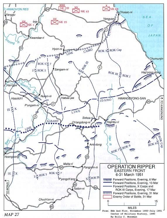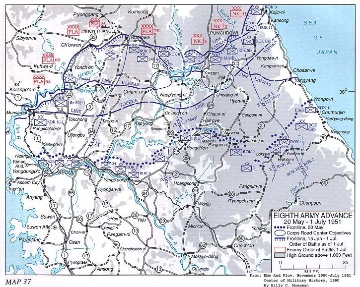 東部韓第1軍方面:在海軍艦砲支援下,沿海岸道路北進,於5月30日奪取杆城。