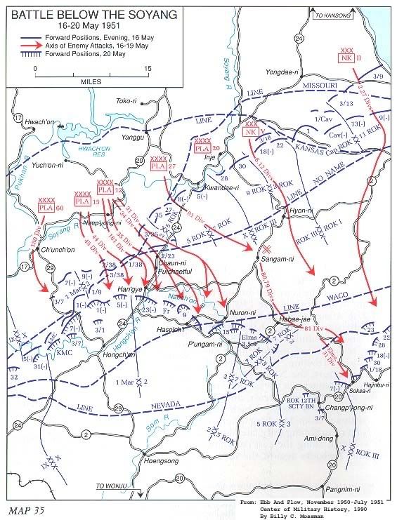 5月16日黃昏,中朝軍發起總攻擊,主攻指向韓5師、韓7師。韓國軍陣線再度如細沙般遭到志願軍之浪潮沖垮,崩潰後撤。