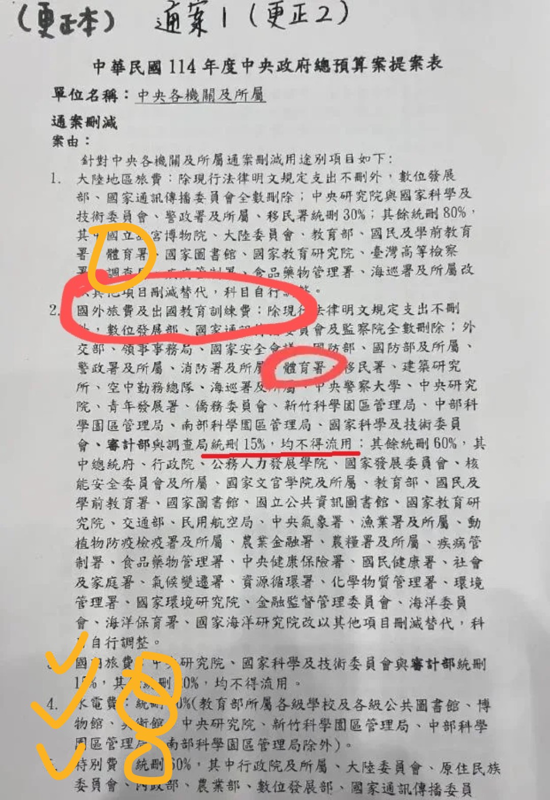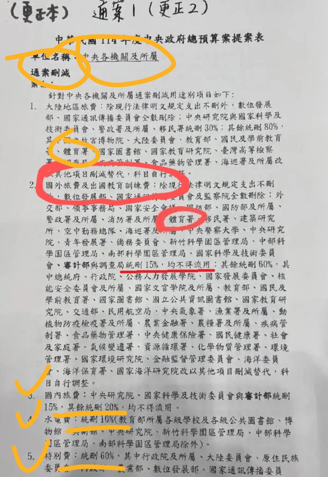 刪國外旅費&出國教育訓練費的15%,而不是刪全體經費的15%