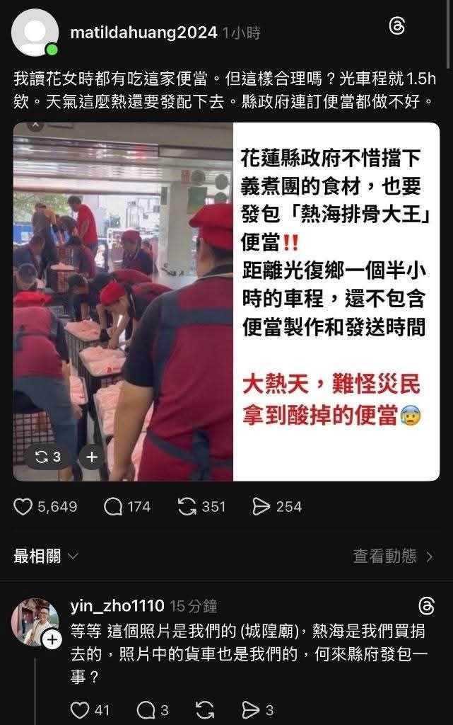 一、本次賑災便當係由 花蓮城隍廟 與 中華城隍文化總會50間城隍廟 共同出資,向「熱海