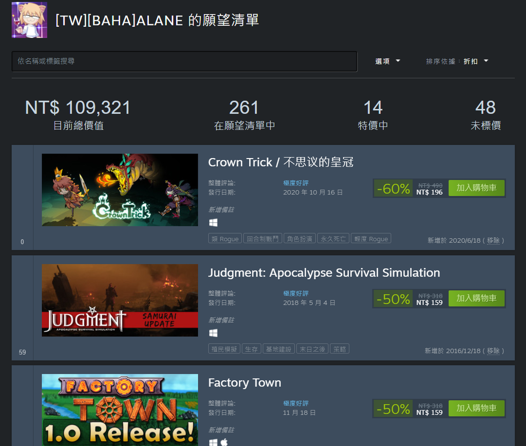 或是特賣清佇列,讓遊戲自己來被我找到,不太願意在平時去增加願望清單,