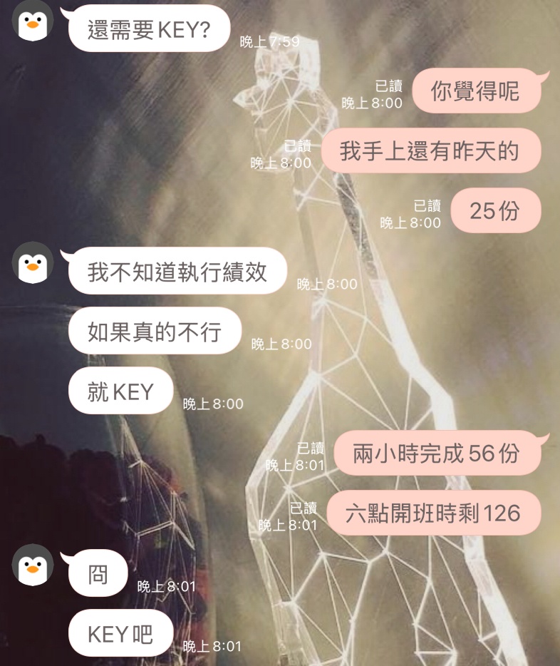 況且三天根本完成不了750份 平均一天要250份 一個班四個小時 一小時要完成63份 他們現在根本沒那麼多人可以完成這些 嘻嘻