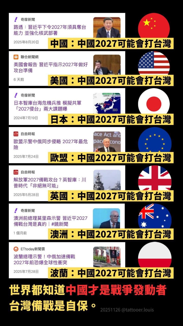 不僅如此,北京當局也以2027年完成「武統台灣」為目標,加速侵略台灣的軍事整備,持
