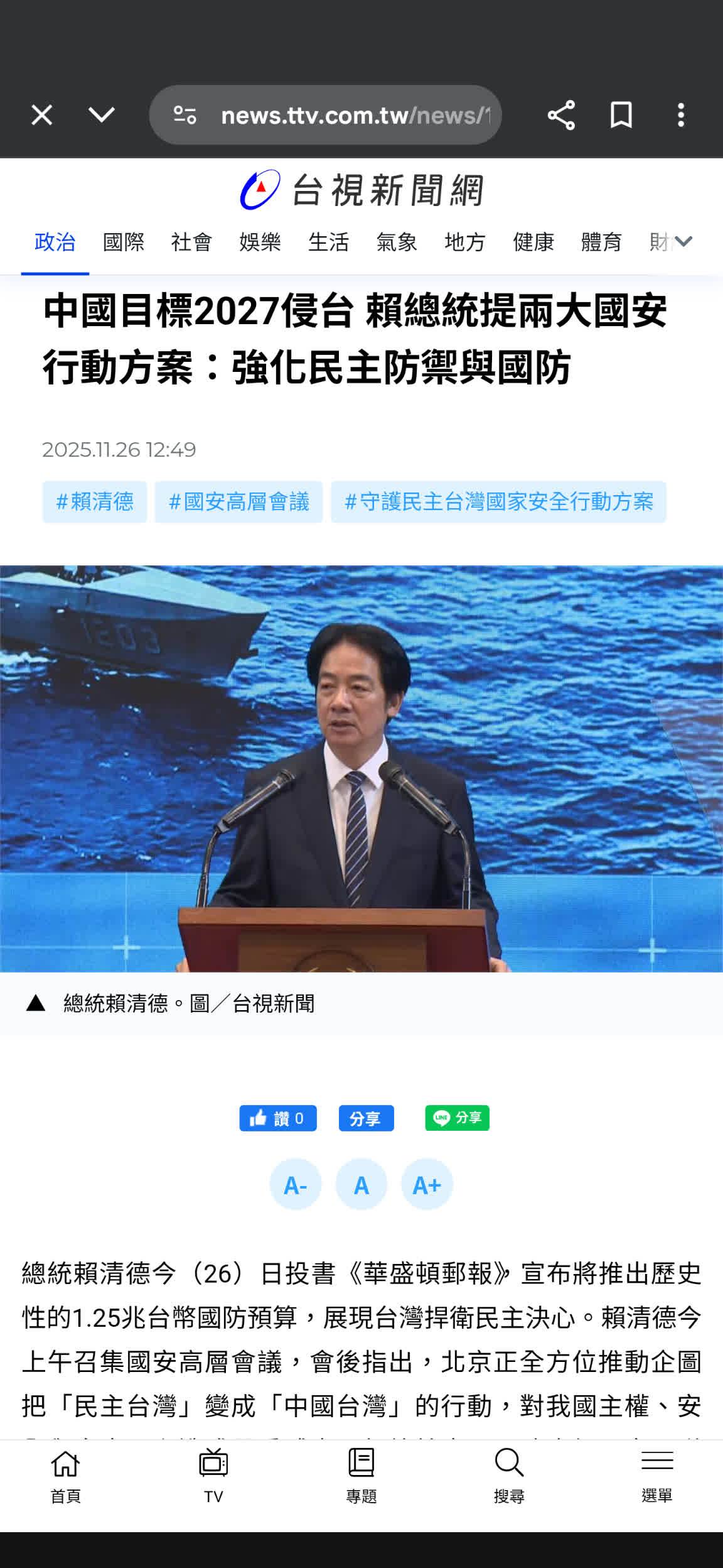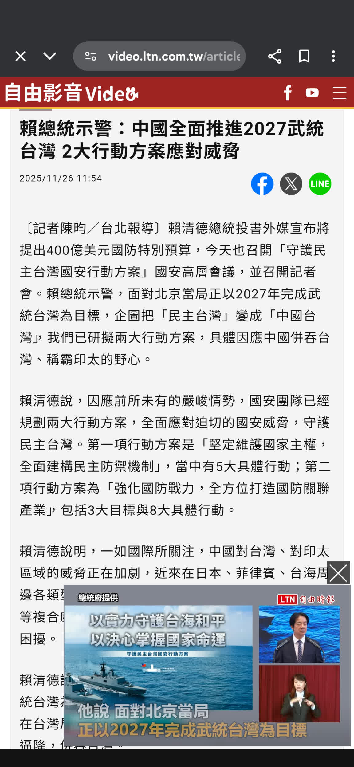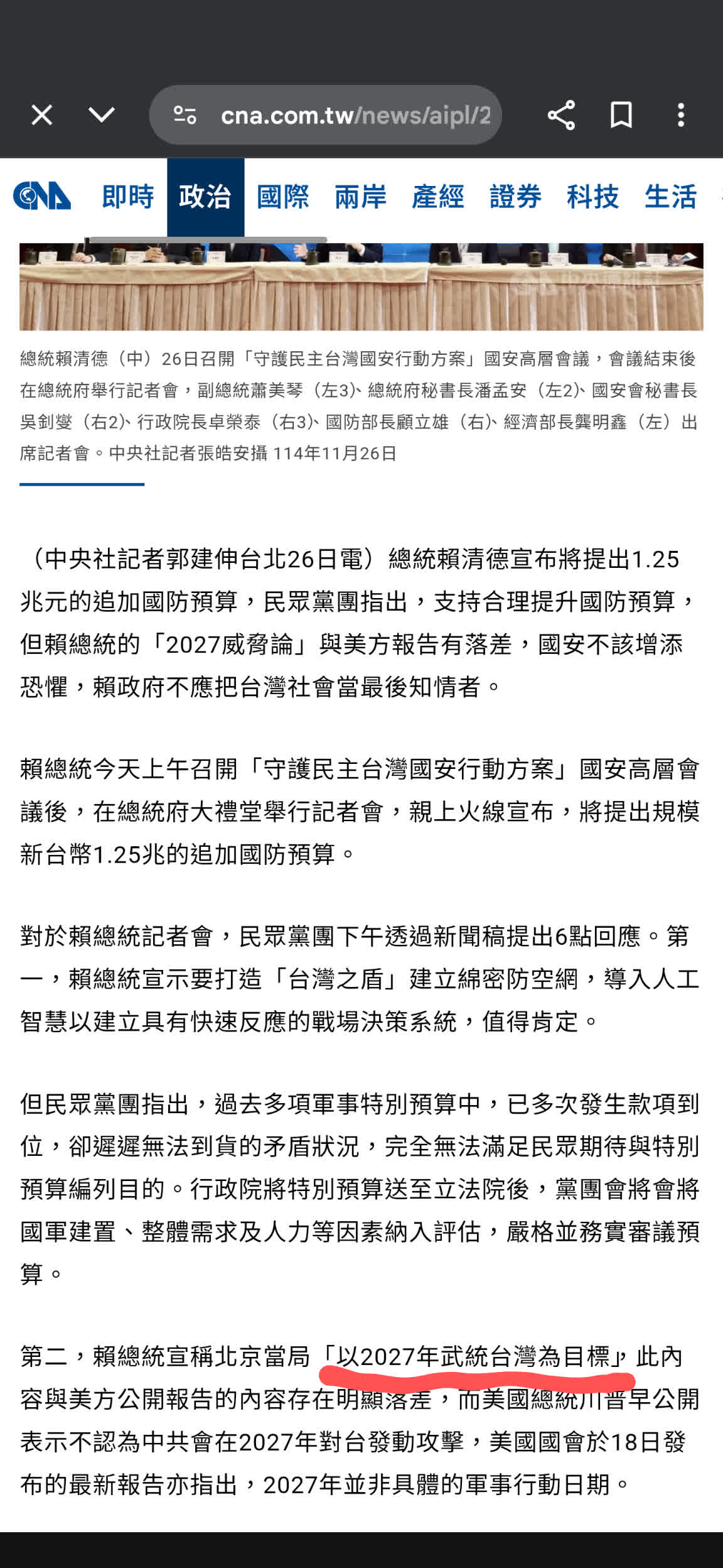 : 3.完整新聞標題:賴清德證實北京2027年侵台? 總統府駁斥:錯誤的片面解讀