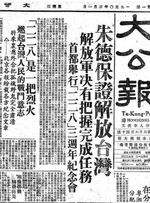 1950年3月「大公報」頭版頭條,中國共產黨在北京舉行228三週年紀念大會。此時期共軍在福建沿海集結二野、三野一部共50萬人大部隊,準備一舉渡海「解放台灣」,228事件後台灣人組織「台灣民主自治同盟」則潛往大陸,準備隨共軍來台,進行民政接管工作,同時完成228事件中國內戰末竟之業。